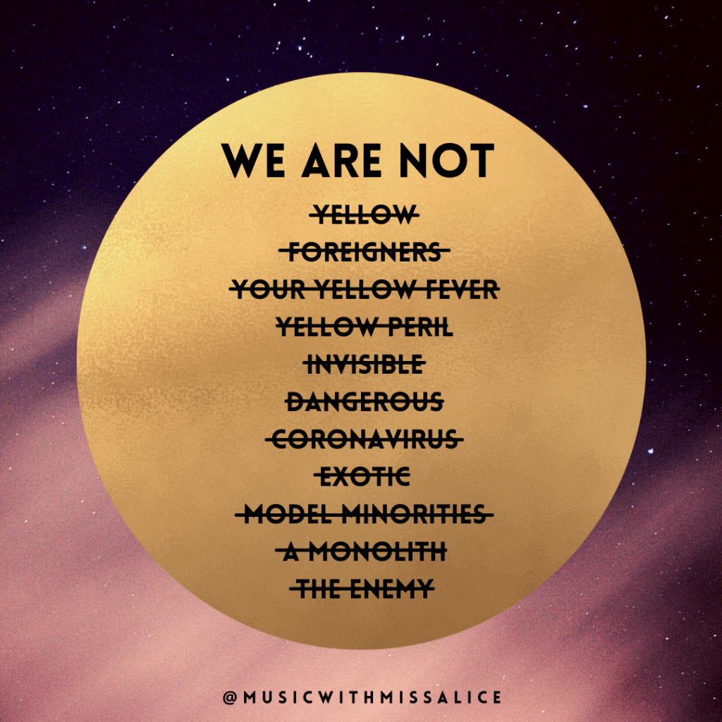 Asian Americans: We actively renew racist rhetoric in our language if we do not understand the intersectional history of standing for and with Asians. We can embrace the history of activism that comes with “yellow peril” and denounce its usage when used by non-asian folx to describe our humanity. We can bravely share our narratives because each one of us matters – individually AND as part of the Asian diaspora.