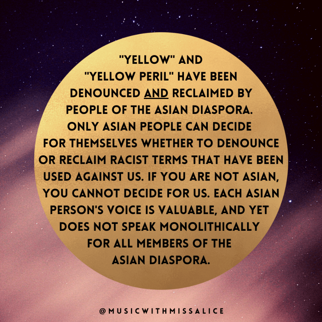“Yellow” and “Yellow Peril” have been denounced and reclaimed by people of the Asian diaspora. Only Asian people can decide for themselves whether to denounce or reclaim racist terms that have been used against us. If you are not Asian, you cannot decide for us. Each Asian person’s voice is valuable, and yet does not speak monolithically for all members of the Asian diaspora.