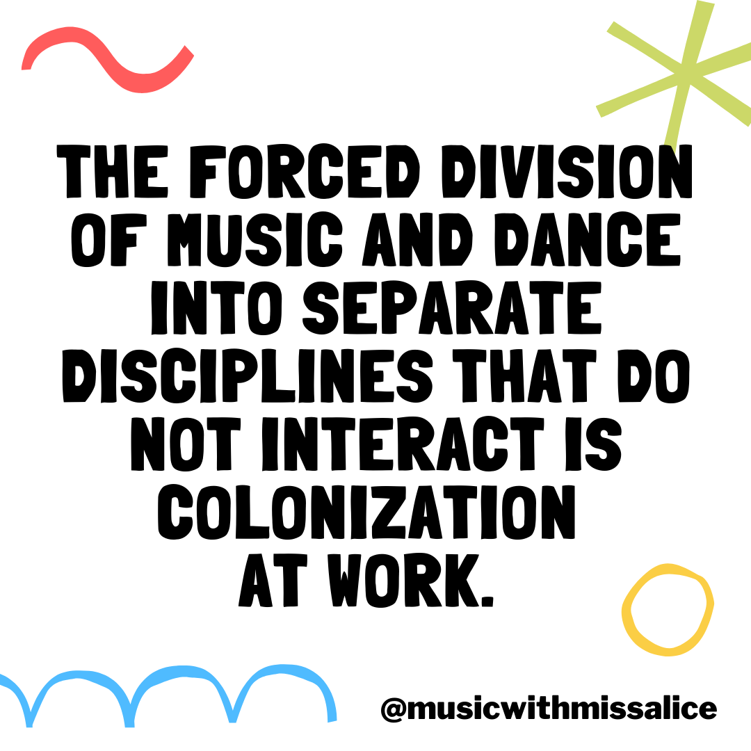The forced division of music and dance into separate disciplines that do not interact is colonization at work. There is nothing that dictates the separation of the two aside from the colonization of our minds.