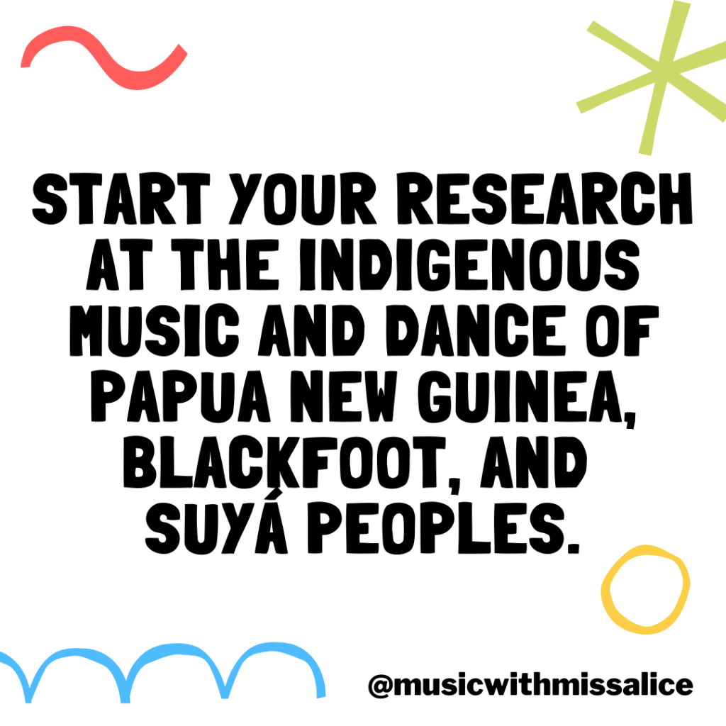 Start your research at the indigenous music and dance of Papua New Guinea, Suyá, and Blackfoot peoples. This is a non-comprehensive list and simply a suggestion for a starting point.