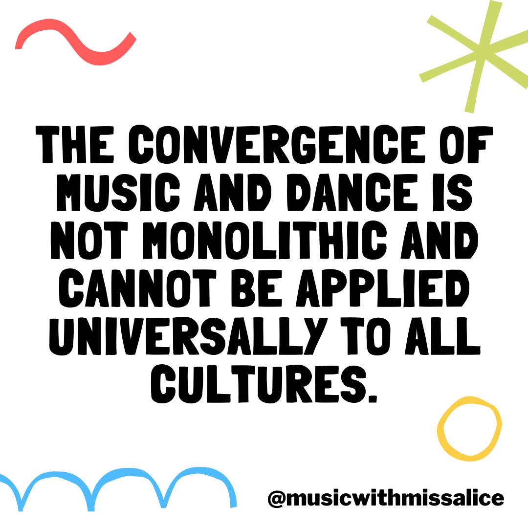 The convergence of music and dance is not monolithic and cannot be applied universally to all cultures. Generalizing will only lead to erasure of individual voices in each culture.