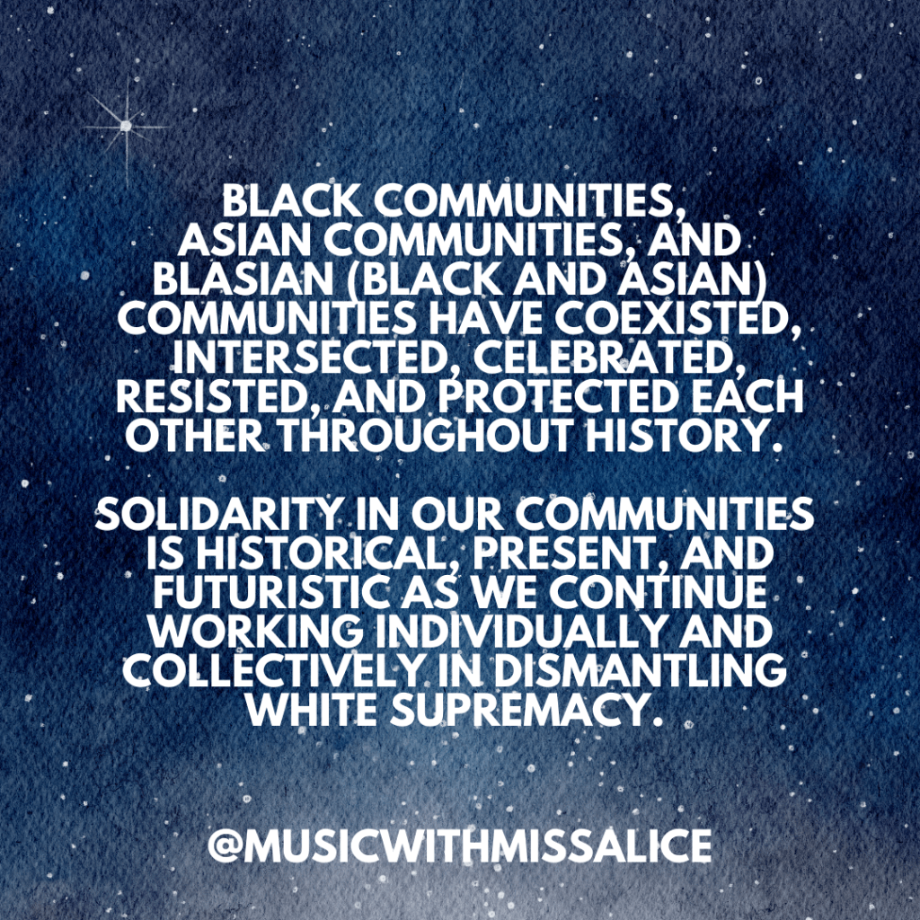 Black communities, Asian communities, and Blasian (Black and Asian) communities have coexisted, intersected, celebrated, resisted, and protected each other throughout history. Solidarity in our communities is historical, present, and futuristic as we continue working individually and collectively in dismantling white supremacy.