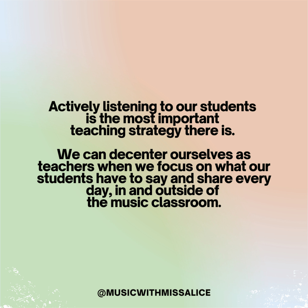 Actively listening to our students is the most important teaching strategy there is. We can decenter ourselves as teachers when we focus on what our students have to say and share every day, in and outside of the music classroom.