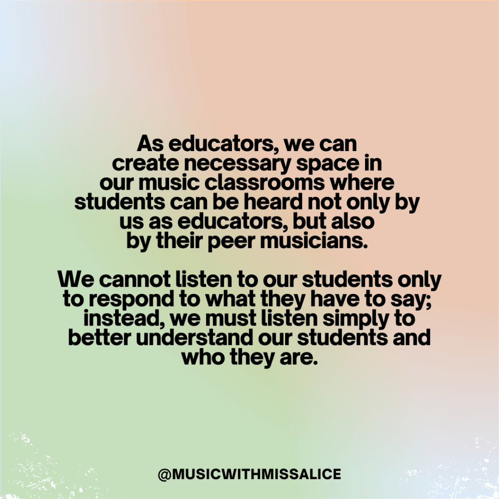 As educators, we can create necessary space in our music classrooms where students can be heard not only by us as educators, but also by their peer musicians. We cannot listen to our students only to respond to what they have to say; instead, we must listen simply to better understand our students and who they are.