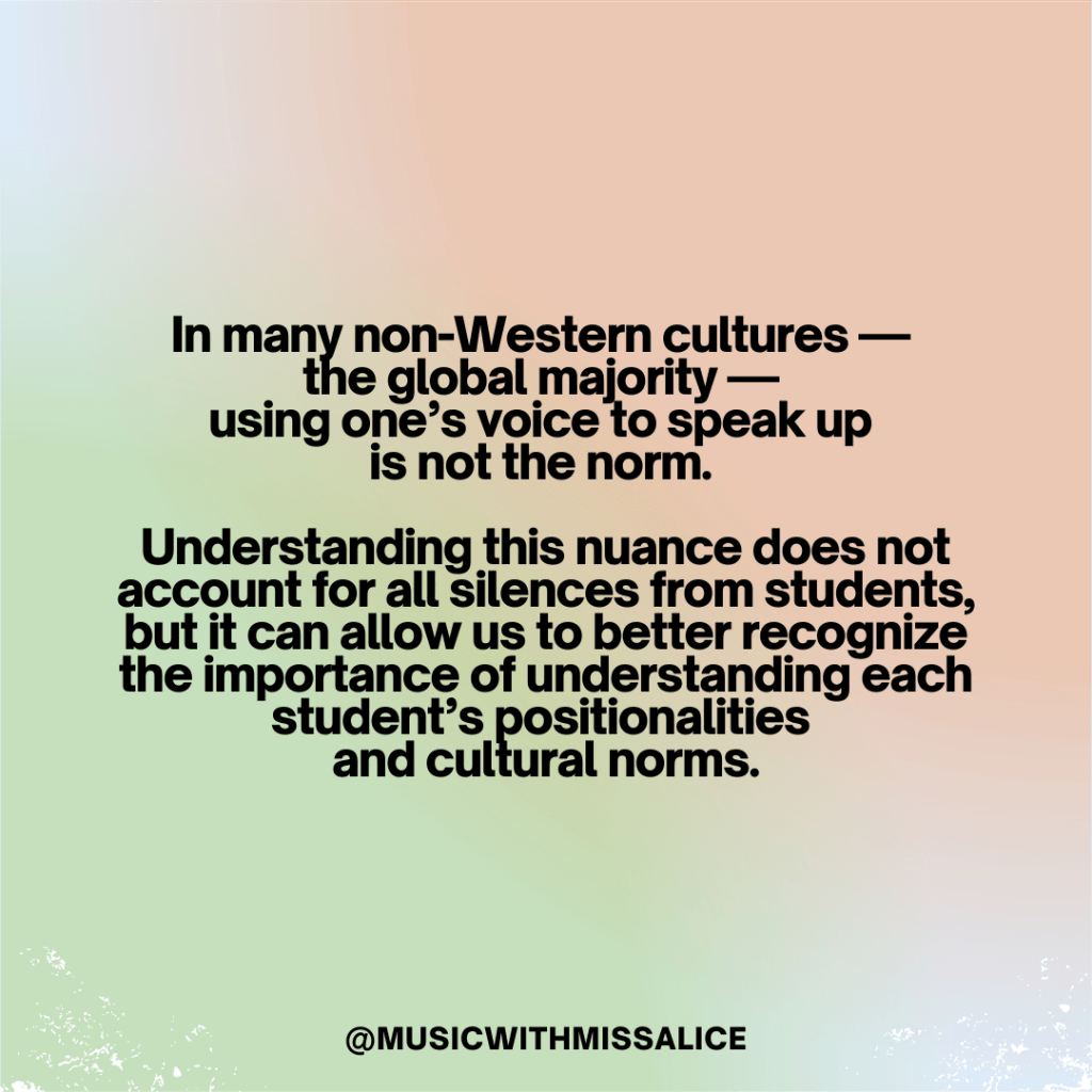 In many non-Western cultures — the global majority — using one’s voice to speak up is not the norm. Understanding this nuance does not account for all silences from students, but it can allow us to better recognize the importance of understanding each student’s positionalities and cultural norms.