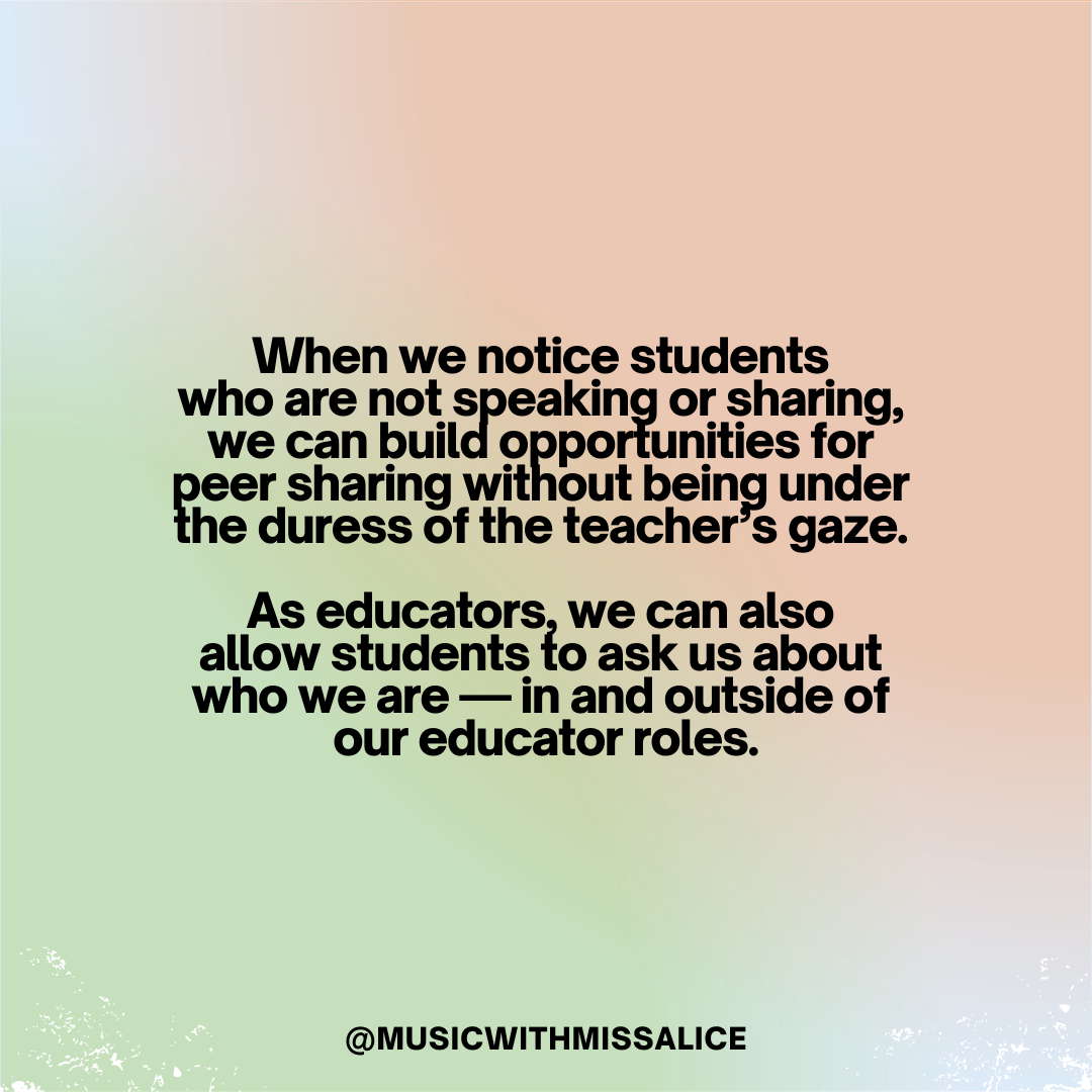 When we notice students who are not speaking or sharing, we can build opportunities for peer sharing without being under the duress of the teacher’s gaze. As educators, we can also allow students to ask us about who we are — in and outside of our educator roles.